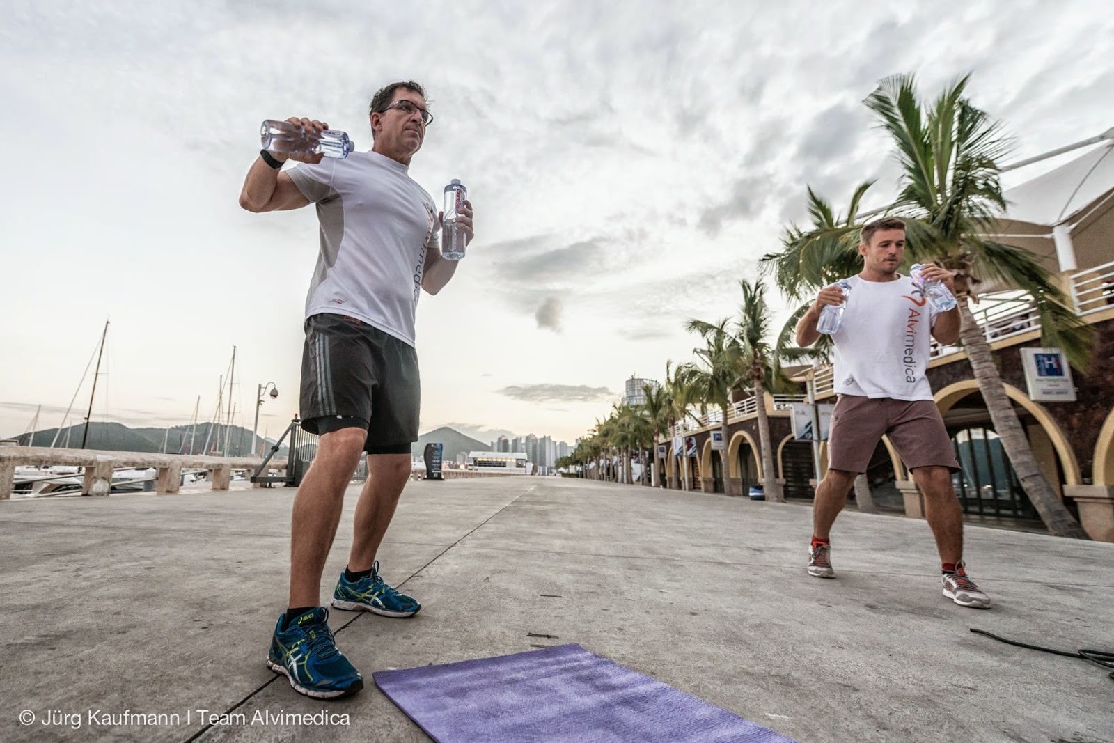 Team Training: 2 Flaschen Wasser, eine Yoga Matte und ein Gummiseil, so trainieren Profies, es muss nicht immer das Top Fitness sein. Bilder exklusiv © Juerg Kaufmann.