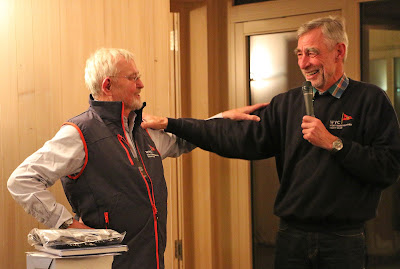 Bobby Schenk (links), dreifacher Weltumsegler, referierte beim WYC-Salzwasserstammtisch im bis auf den letzten Platz besetzten neuen Clubhaus in Seemoos über sein Seglerleben. WYC-Präsident Ekke Diesch, selbst auch Weltumsegler, bedankte sich bei Schenk mit einer Grundausstattung des Clubs: Shirt und Weste mit dem WYC-Logo, das Jubiläumsbuch und ein Karton herzoglich-württembergischer Wein.